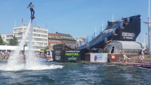 Das die jährlich stattfindende Kieler Woche, als große Segelregatta und Volksfest, den Besuchern nicht nur an der Kiellinie, an der Hörn oder auf dem Nordmarksportfeld, ein erhebendes Gefühl garantiert, zeigte die Funsportart des Flyboarding, an der 14 Meter hohen Rampe im SEIKO Prospex OCEAN Funpark am Kieler Bootshafen in der Innenstadt von Kiel in Schleswig-Holstein.